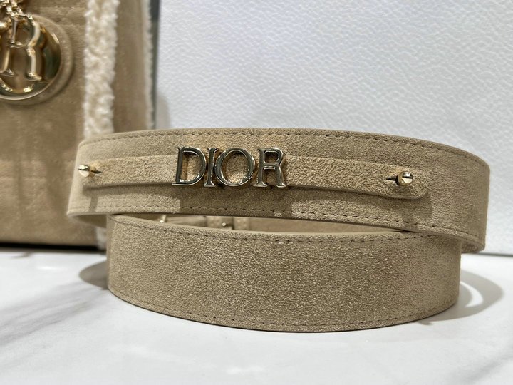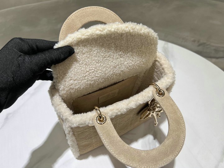 Top original four-grid lady d ior handbag beige suede and off-white sheepskin shearling No.: m0538oblq_m900This lady d ior handbag epitomizes d ior’s profound insight into elegance and beauty. The chic and elegant design is timeless. Crafted from beige suede, decorated with cannage stitching and paired with off-white sheepskin shearling, it highlights d ior’s exquisite craftsmanship. With a light gold-finished metal d.i.o.r. charm, it adds a touch of agility to the exquisite silhouette. The small style, with a detachable chain shoulder strap, can be carried by hand or cross-body, making it an ideal companion for evening wear. Body: sheepskin lining: sheepskin shearling detachable chain internal zipper pocket can be matched with other d ior embroidered shoulder straps as you like Dust bag included Made in Italy Dimensions: 20 x 17 x 8 cm (length x height x width)